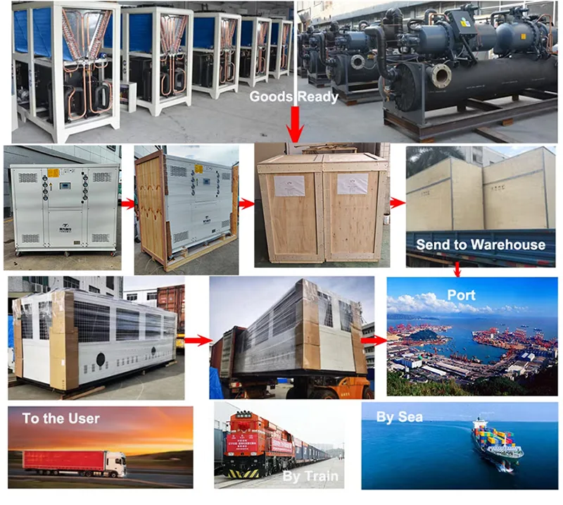 একজন পেশাদার ওয়াটার চিলার সরবরাহকারী এবং রপ্তানিকারক হিসাবে, চালানের ব্যবস্থা করার জন্য আমাদের নিজস্ব শিপমেন্ট ফরওয়ার্ডার রয়েছে। আমাদের চিলার মেশিনটি প্লাইউড প্যাকিং সহ, যা পরিবহনের সময় ক্ষতি প্রতিরোধ করে এবং রপ্তানি মান পূরণ করে। তিনটি উপায়ে আপনার চিলার ইউনিট সরবরাহ করতে পারে: